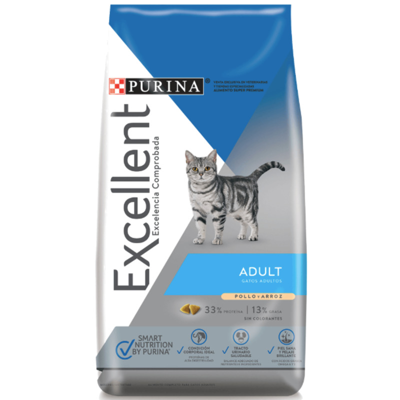 PURINA® Excellent® Adulto Pollo y Arroz, ofrece una fórmula con una óptima combinación de ingredientes, proteínas de alta digestibilidad y ácidos grasos omega 3 y 6, para mantener al máximo la salud del gato adulto.